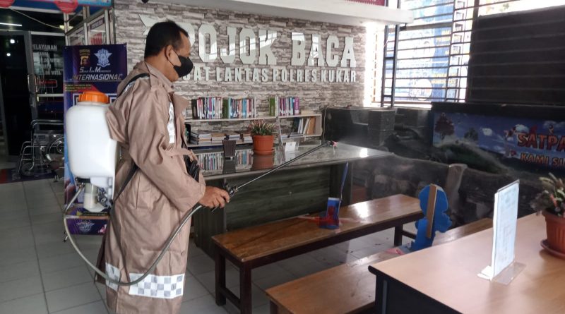 Guna Mencegah Menyebaran Covid 19, Satlantas Polres Kukar Rutin Lakukan Penyemprotan Disinfektan Diruang Pelayanan