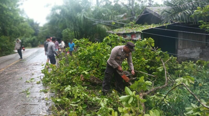 Paser – Anggota Polsek Tanah Grogot Polres paser gerak cepat memberikan bantuan dalam evakuasi pohon yang tumbang dan mengatur lalu